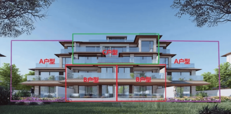 C户型:两个B户型的面宽变成上层复式产品,超大面宽,超大露台,非常好的隐私。