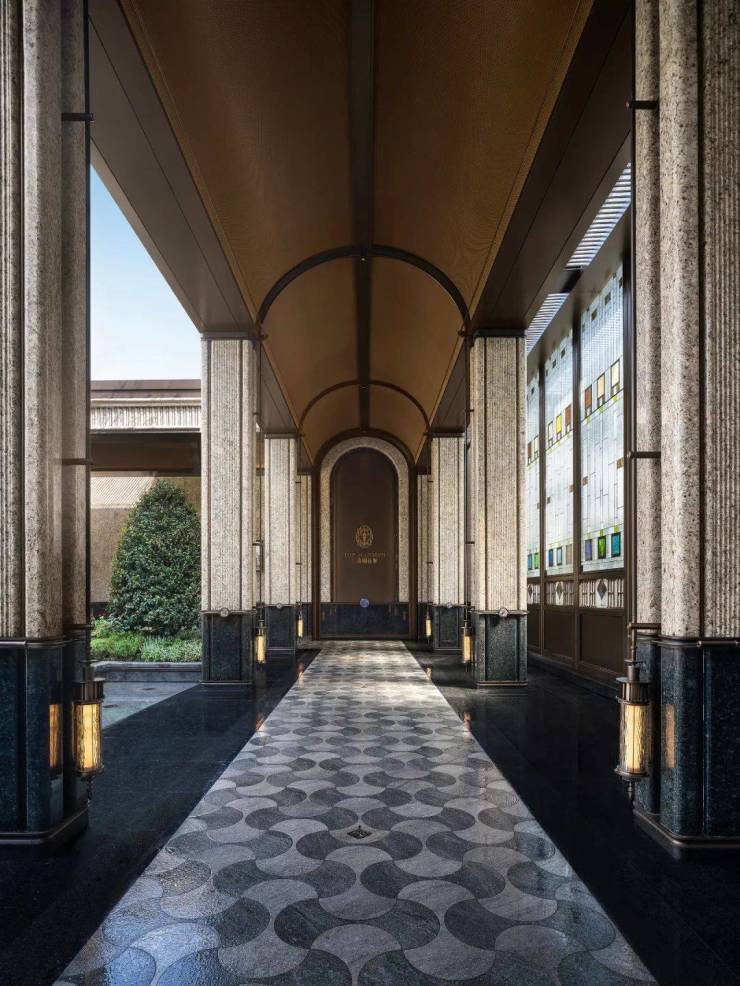 走进落客区,头顶美轮美奂的约300㎡彩色玻璃穹顶,灵感来自于和平饭店,融入老洋房PRADA荣宅的特殊徽章转译。其中水波纹玻璃、镶嵌玻利维亚蓝奢石带来了丰富的层次感,光影相间的繁复感,仿佛让人步入时光长廊,这样充满艺术性的归家礼仪,让人一眼着迷!