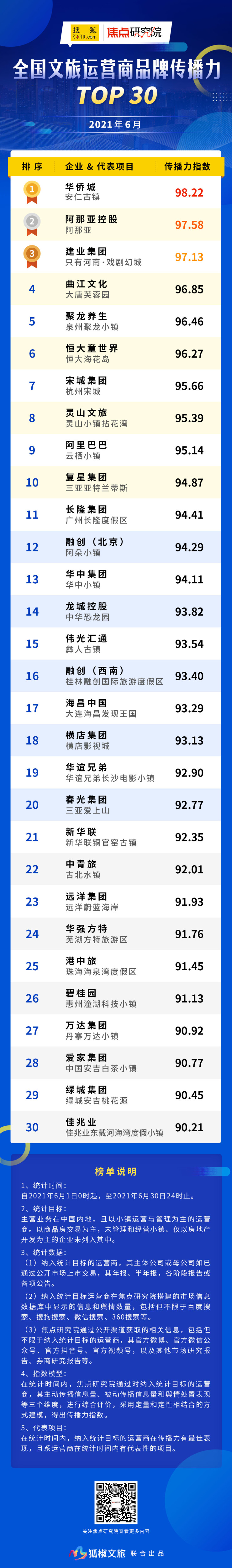 权威发布 | 6月全国文旅运营商品牌传播力TOP30