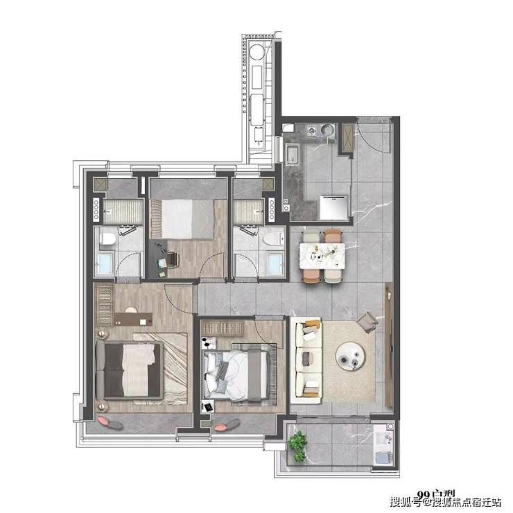 建面约99㎡3房2厅2卫户型图: