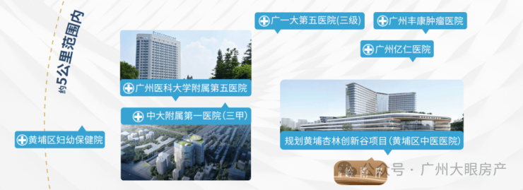 约5公里范围内多家三甲医院环绕:黄埔区中医医院(三甲,建设中),距离项目约500米,打造黄埔区首个国家级中医药领域示范高地;中大附属第一医院东院区(三甲);广州医科大学附属第五医院(三甲)等。