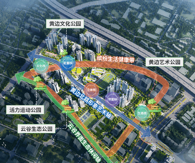 项目紧邻黄边艺术公园,未来将与黄边文化公园、活力运动公园、云谷生态公园四大主题公园相串联,形成自然与人文共生的活力空间。