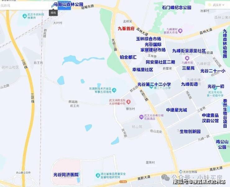 九峯首府项目位于森林大道与光谷三路的交汇处,属于东湖高新区光谷中心城板块,并且项目与三环线的直线距离仅约1.6公里,属于光谷中心城板块十分接近三环的项目之一,环线地段较光谷东多数项目都要好。