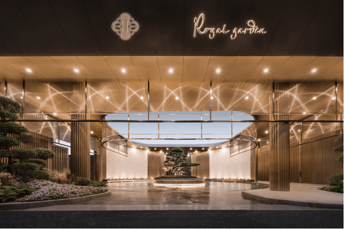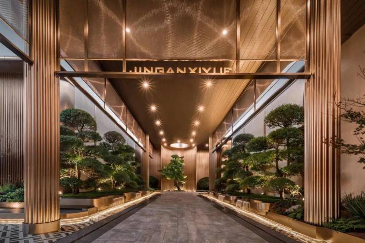 整个美学示范区的景观设计是按照“翡光礼境”概念,浓缩精华而成的。走进示范区,即为酒店港湾式落客空间,暖色调上加入金属线条点缀,营造人文艺术的隐奢感,为归家业主和访客提供了由动至静的缓冲区域,配合朗阔尺度的门头,仿佛置身于顶奢酒店门前。