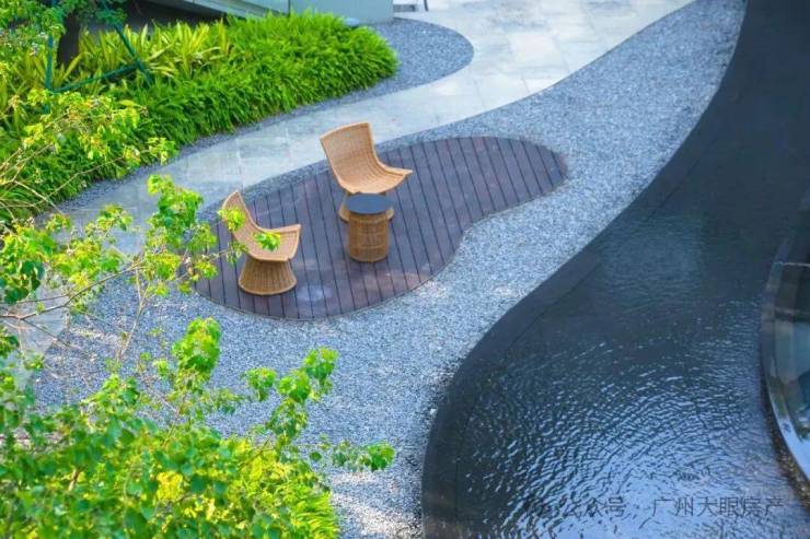 流水、瀑布等景观的营造,消弭了珠江与建筑的边界。让人步入小区中,也仿佛能听到珠江水的流动,瞬间忘却外部的喧嚣,投入自然的环抱。
