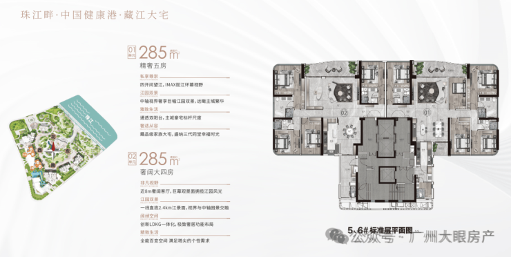 户型:建面约233-285㎡四至五房,东向/东南向一线望江,极致3.4-3.6m层高