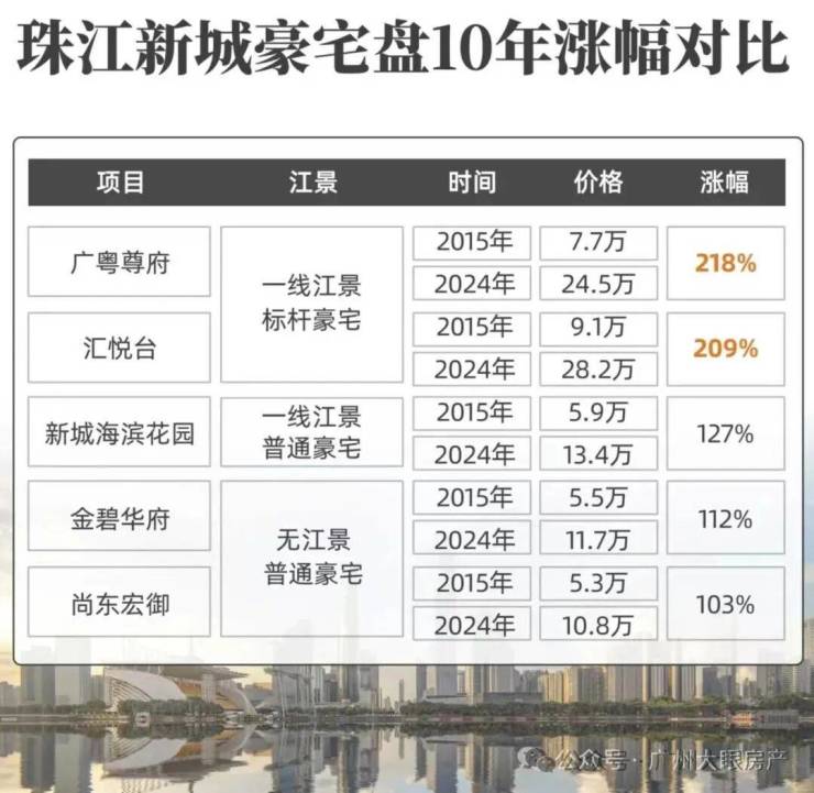 像同在珠江新城东区,占据一线江景的标杆顶豪盘,不仅总价更高,涨幅也远远甩开其它没有江景或者品质一般的豪宅盘。