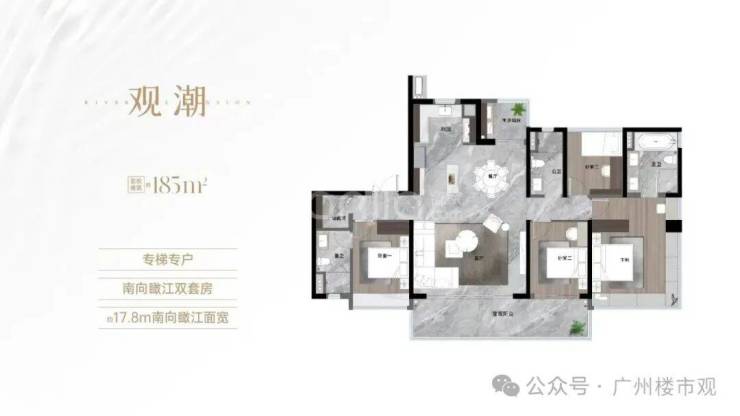 约185㎡四房,约17.8米南向面宽,约74㎡LDKB奢阔方厅、双景观阳台瞰江揽园、双南向套房设计,打造更大的生活交流聚场。