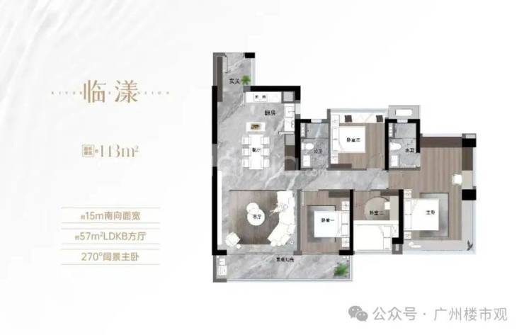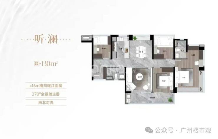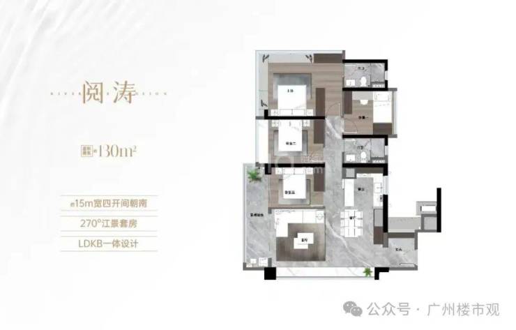 约130㎡四房,约15-16米南向四开间、LDKB一体化设计、270°江景主卧,用尺度与视野打破空间限制。