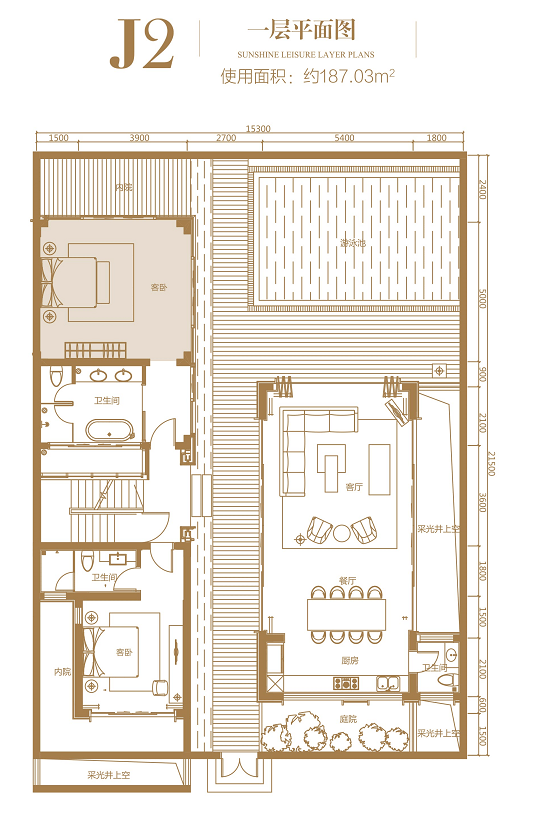 一层:使用面积约 187.03㎡,