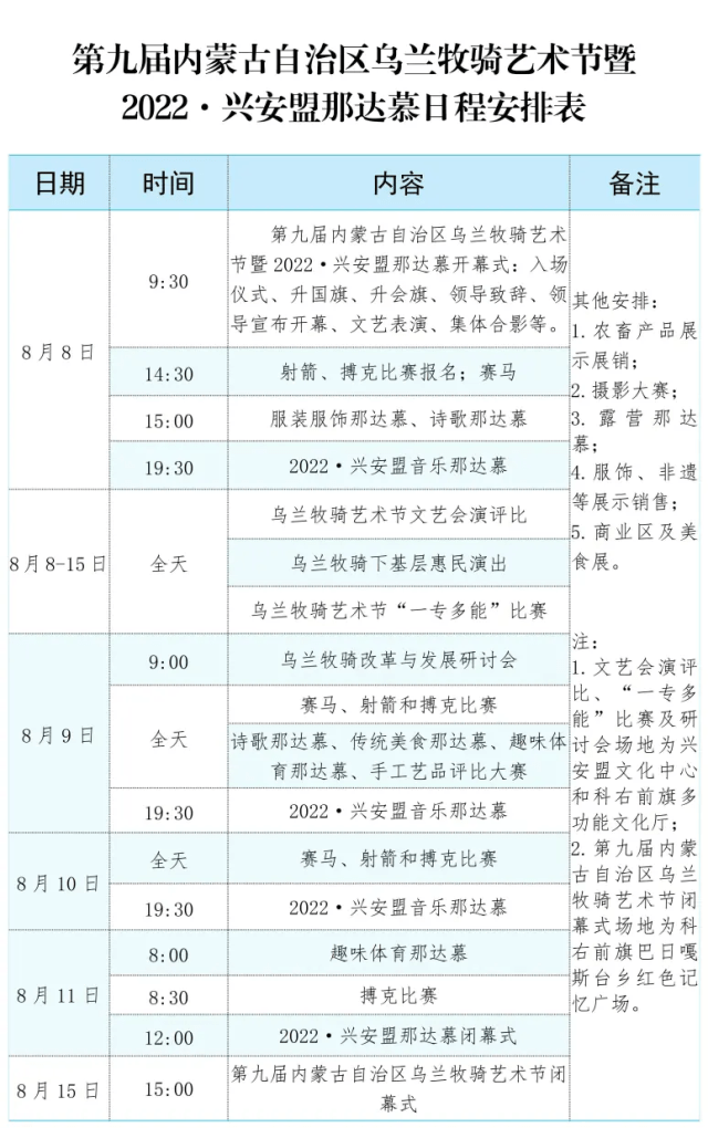 永远做草原上的红色文艺轻骑兵,第九届内蒙古自治区乌兰牧骑艺术节暨2022·兴安盟那达慕将于2022年8月8日至15日在兴安盟科右前旗举办,日程安排终于出炉。赶快来查看2022·兴安盟那达慕日程安排吧!