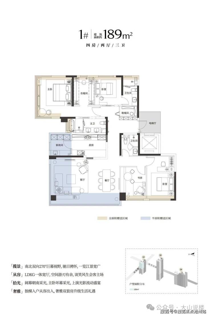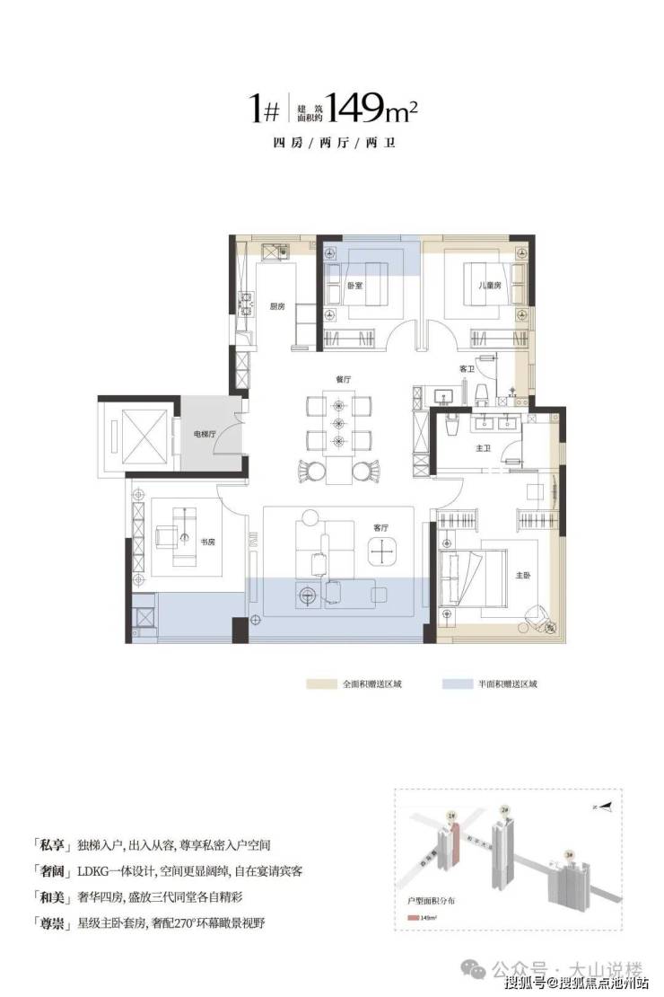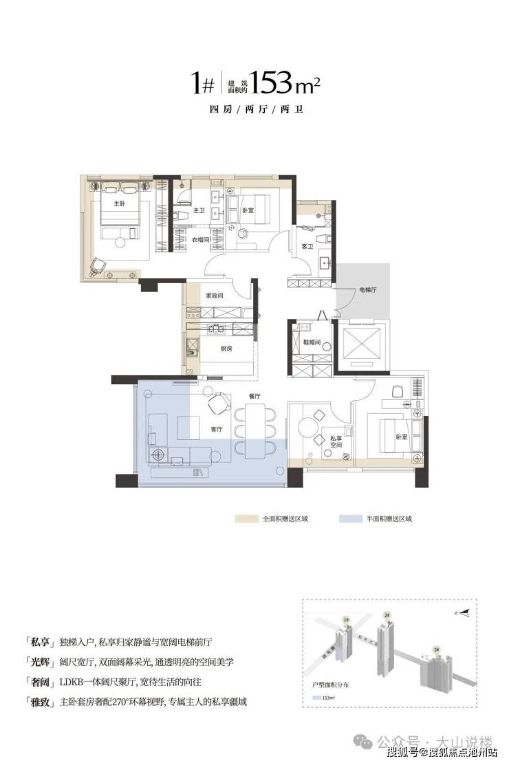 关于户型建面约149m²的户型设计为4房2厅2卫,在1、2号楼均有覆盖。全明户型,空间利用率高,浪费面积少,主卧配备独转角落地窗,采光和视野好。独立入户电梯厅,私密性强。不过从户型图上看,设计为房间环绕起居室的布局,可能存在空间上动静分区不明确的情况。建面约153m²4房2厅2卫,将客厅、餐厅、厨房完全打通,实现空间最大化,增强家人间的互动性。其布局打破了传统严格的动静分区,更适合追求现代开放式生活方式的家庭。270°环幕视野,江景一览无余的同时可能面临西晒的情况。