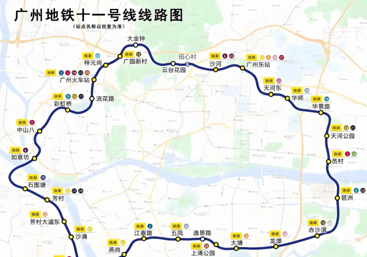 11号线是广州首条市区大环线,串联广州中心五区,与广州现有及未来的所有地铁实现换乘,被称为“换乘之王”虹吸全广州的优质资源