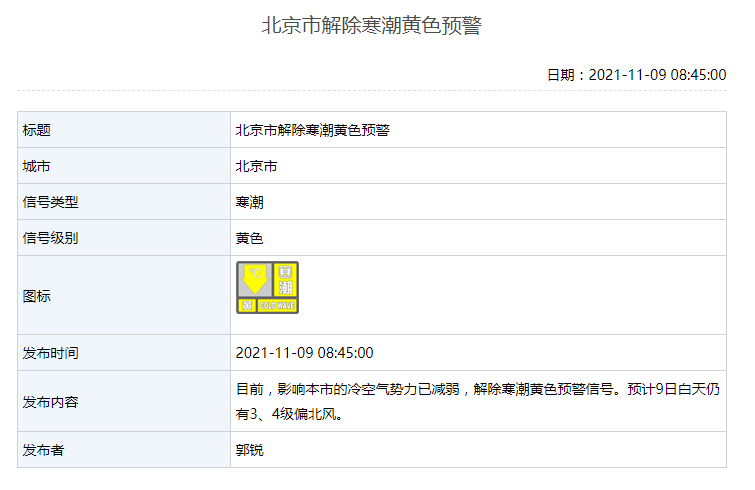 新京报快讯 据北京市气象局消息,目前,影响北京市的冷空气势力已减弱,解除寒潮黄色预警信号。预计9日白天仍有3、4级偏北风。