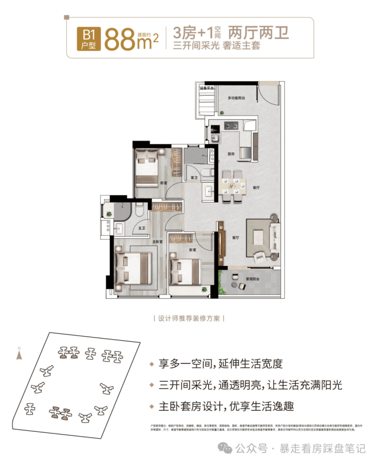 🔅约76-88㎡3房+1空间、119-194㎡4房+1空间至五房,正南向阳光户型,+1空间更实用。