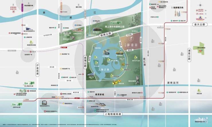 项目位干上海之鱼内,东侧是极具特色的金汇港,水脉碧波倒映生态景观。坐拥约万亩林地,占地面积约4.78平方公里南上海中央公园,更拥享上海之鱼约13公顷环湖景观带和集艺术展览、活力健身、娱乐休闲、游憩观赏为一体的现代城市公园群。