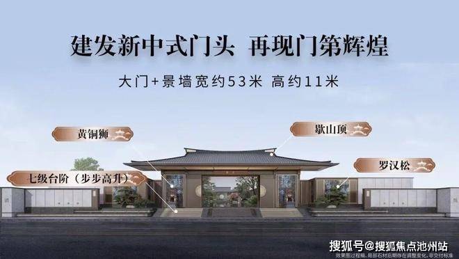 ◎一进:礼序前庭(约53米宽、10.85米高的歇山顶中式大门搭配罗汉松和黄铜狮)