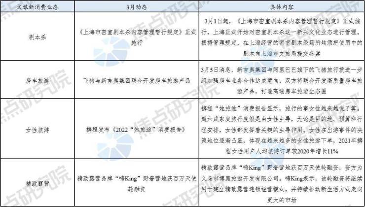 引言 :3月,文旅行业新政涉及创新业态和区域发展两大方面。区域发展方面,国家发改委印发《长江中游城市群发展“十四五”实施方案》,力图再造一个区域级乃至全国级的文旅小高地。创新业态方面,商务部等八部门联合印发《关于促进老字号创新发展的意见》,为根植于传统文化的老字号企业复兴提供了契机。文旅新消费领域,在三八妇女节到来之际,携程发布了《2022“她旅途”消费报告》,描摹了“她经济”下女性旅游的三重身份——辣妈族、飒爽女、老来俏以及各自的消费特征。《上海市密室剧本杀内容管理暂行规定》于3月1日正式施行,剧本杀行业将步入实质性的规范和洗牌阶段。精致露营品牌“嗨King”野奢营地在本月获百万天使轮融资,该轮融资将继续用于建立精致露营连锁经营模式,并持续推动新生活方式走向更大的市场。新吉奥集团则与飞猪旅行就进一步加强房车业务合作达成意向,双方将联合开发高质量房车旅游产品。