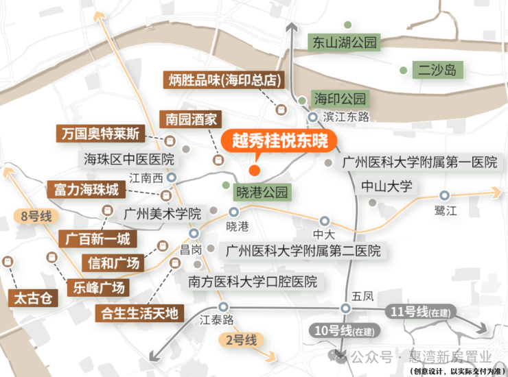 核心优势:项目距地铁8号线晓港站约600米,步行8分钟可达,8号线可直达琶洲、客村等核心区域,1站到昌岗换乘2号线,3站到客村换乘3号线,30分钟内可达珠江新城;对口海珠外国语实验中学附属小学(省一级,纳入海珠区实验小学教育集团),周边1公里内全龄名校环绕,包括南武实验学校、海珠外国语实验中学等;紧邻约17万㎡晓港公园(步行约200米),高层可远眺珠江、广州塔景观;周边有江南西商圈、太古仓商圈等成熟商业配套,步行可达;配备岭南园林设计,融入广雕、千年广绣、广府花窗等文化元素,架空层打造全龄会所、社区学堂、图书馆等配套。