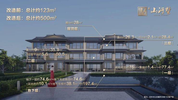 以极致产品力,打破空间桎梏。建面约126-139㎡户型,实际使用面积超500-600㎡的越级尺度,极致产品设计兑现真正宽境墅居,以126㎡的户型为例: