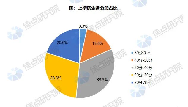 仅2家房企得分超50分,12家房企得分低于20分。60家入榜的上市房企中,得分超过50分以上的仅有中国海外发展(00688.HK)和龙光集团(03380.HK)两家公司,数量占比为3.3%;40分-50分房企共9家,占比15.0%;30分-40分房企共20家,占比33.3%;20分-30分房企共17家,占比28.3%;得分低于20分房企共12家,占比20.0%。
