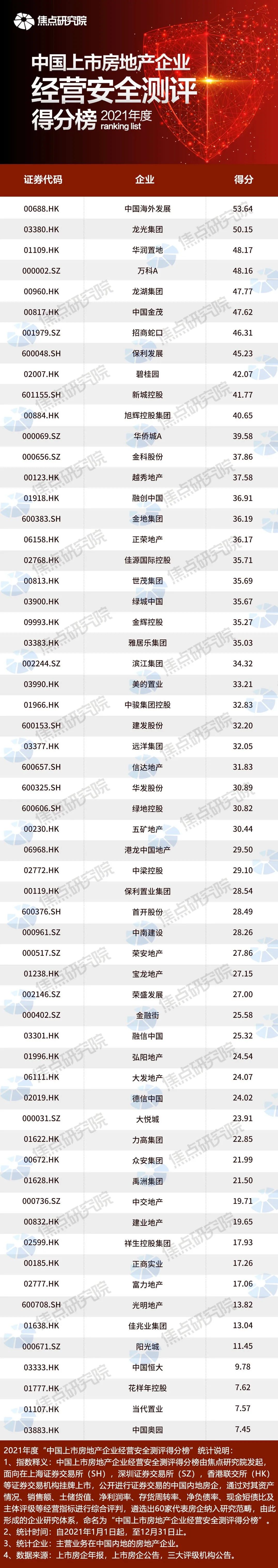 2021年房地产市场政策频出、调控不断。从“三道红线”、“两集中供地”到住房贷款集中管理、房产税试点城市的推进,政策的不断推出让房地产行业迈入新的时代。2021年以来,房地产企业风险事件频发,高速扩张下高杠杆导致的资金链断裂、快周转带来的房屋质量下降等现象频出,叠加政策变动、融资收紧等对房企经营制造了巨大压力,形成一系列负面影响。这些风险事件及负面影响不仅导致企业陷入运营困境,更容易将风险传递至行业内其他企业甚至跨行业影响到其他领域的稳定。因此,关注房地产企业安全经营状态,防范房地产行业发生系统性风险具有重要的现实意义。此次安全测评的意义在于规范房地产企业经营行为,引导房地产企业健康成长,有利于房地产行业的可持续稳健发展。焦点研究院对中国上市房企2021年度各项固定指标进行打分,从经营规模、运营能力和财务实力三大维度出发,并引入浮动指标修正体系,形成了一套针对上市房企经营安全的客观、完整的测评体系。最终打分结果如下: