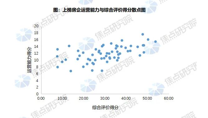 行业整体运营能力差距并不显著。运营能力与综合评价得分相关性最弱,2021年全年房地产行业都面临深度调整,金融政策、土地政策、销售政策空前严厉,过去粗放式的发展模式已无法适应新形势。过去房企仅仅依托土地和资本红利也能维持正常运转,但如今愈发强调精细化运营以及对经营效率的管控。行业整体风险意识的不足导致散点图分布较为集中,众房企无法拉开差距。