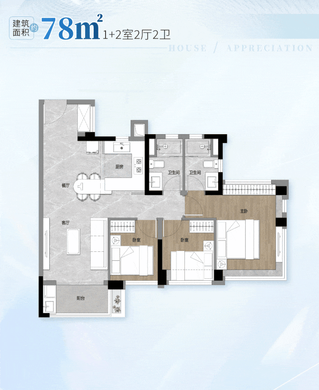建面约82㎡三房,是片区唯一小户型横厅,尺度感不亚于160㎡以上户型。