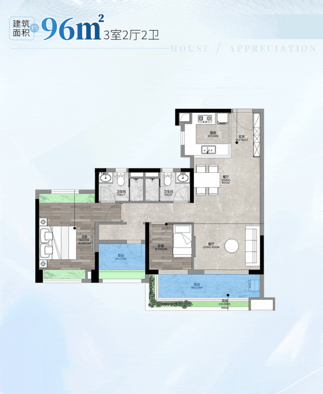 建面约96㎡三房,坐落于小区C位,四开间朝南的巨幕采光,还有约12㎡的大宽面阳台。