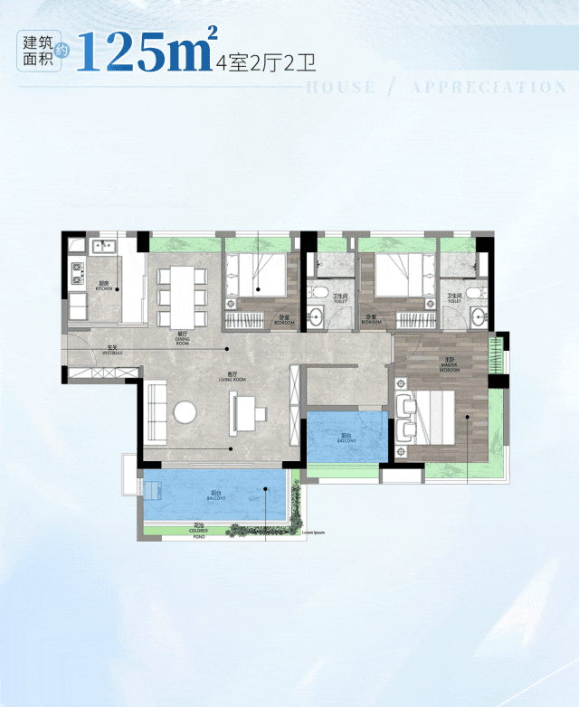 建面约125㎡四房,番禺性价比最高的四房,光是客厅开间,就有约5.4米。