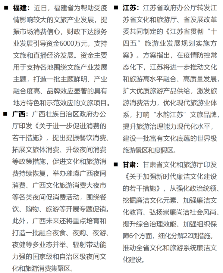 本周,文化和旅游部会同相关部门出台了《关于促进服务业领域困难行业恢复发展的若干政策》及系列金融支持文化和旅游行业恢复发展的政策,同时持续推动减税降费、稳岗就业等纾困政策在文化和旅游领域落细落实,增强文化和旅游企业的获得感。