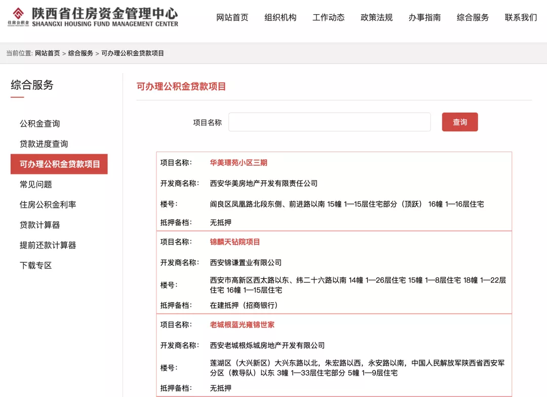 西安目前能使用公积金购买住房的楼盘也相对较少,如需查看对应楼盘,可在陕西省住房资金管理中心网站,综合服务栏中进行查看。