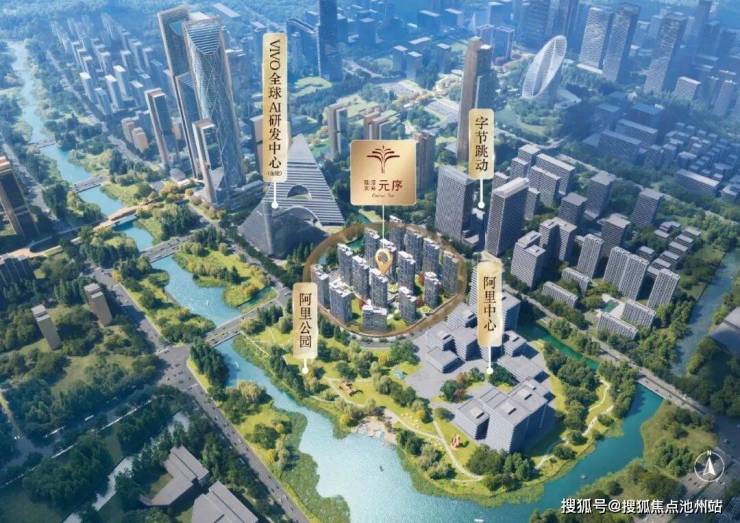 元序所在地块是未来科技城自出让以来,地段最佳一宗宅地,集结了文体地标、百亿商圈、科创总部、公园河景等城市资源。北侧为字节华东中心(刚投入运营),西侧为VIVO全球AI研发中心(在建,幕墙基本完成),西北侧为钉钉总部(已运营),南侧为河道和沿河阿里公园。
