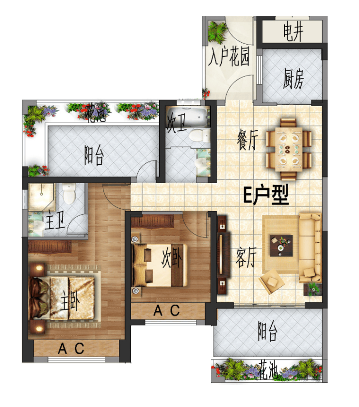 E 户型:典雅舒适两居,约 102.13㎡,2+1 户型,两室两厅两卫。