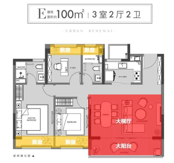 大面积的玻璃幕墙也是豪宅设计标配,户型少不了大横厅设计。户型建面约100-134㎡,覆盖面可以说是很大了,这也是城南所有项目的产品结构。100平的3房2卫,据说抢不到的户型,得房率96%,就是说100平的房子,套内面积有96平这么多。这个100㎡的户型在13层的小高层的中间户,房源不多,赠送面积主要是3个房间的飘窗和一个卫生间的飘窗,再加一半的阳台面积。个人多多少少有点怀疑96%,某桂圆的一个房间把半截高露台墙体打通装到房间里来,再加7788飘窗阳台,好像得房率拉到92%左右吧。