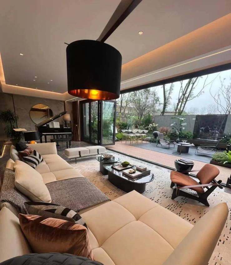 一层生活区围绕着客厅和餐厨功能打造。直面(建筑面积约91㎡)花园的整扇落地折叠玻璃窗,可自由打开,自在进出,达到与自然零阻隔。夏日乘凉喝茶,秋日围炉夜话,其乐融融。
