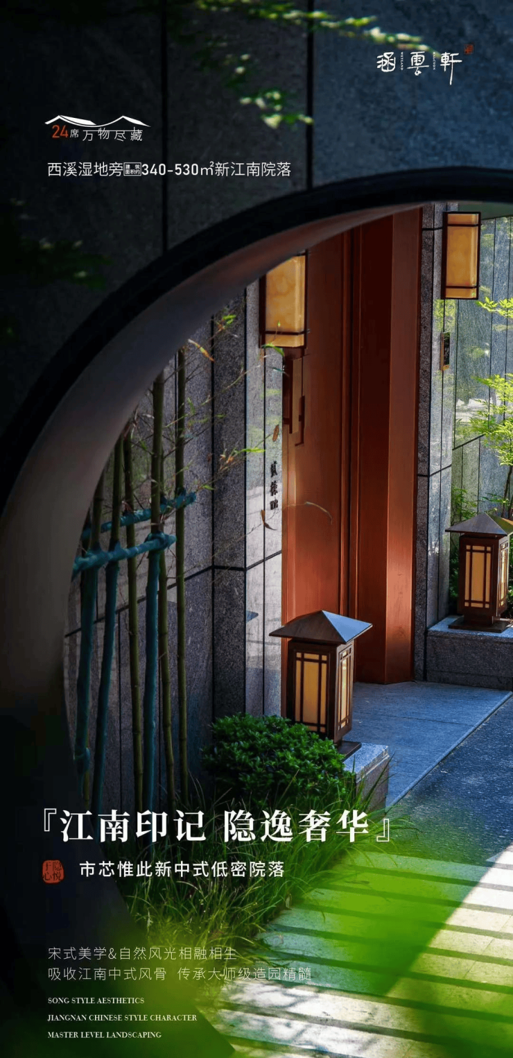 涵云轩坐落在杭州西湖区,中式风格别墅项目,面积达340-530㎡,融合了新江南院落的设计理念。项目背靠着西溪湿地,面朝着西湖山水,仿佛是一个御景园林,将自然之美尽收眼底。这样一个地处杭城封面级双景区的地方,近在咫尺,让人不禁心动