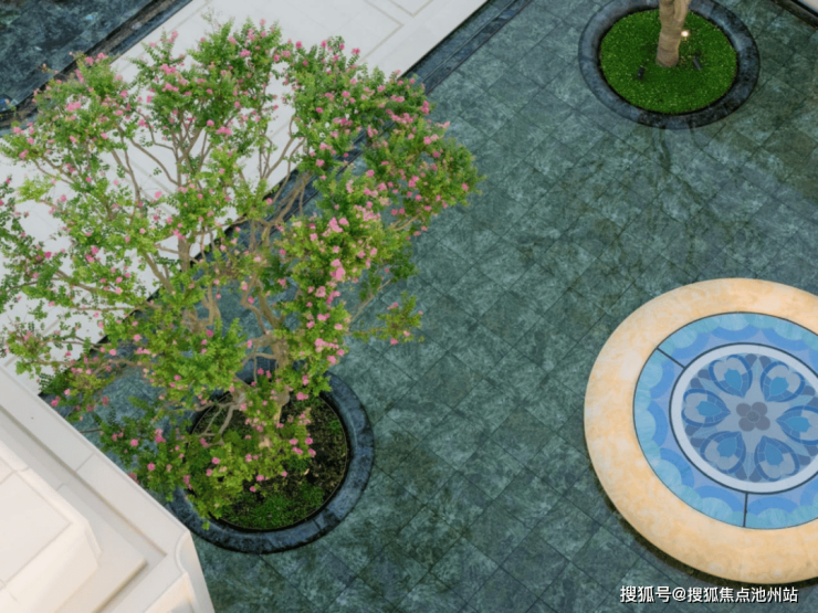 老桩紫薇对植,翡翠蓝石材水景倒映天光,形成浮光掠影的艺术画面。