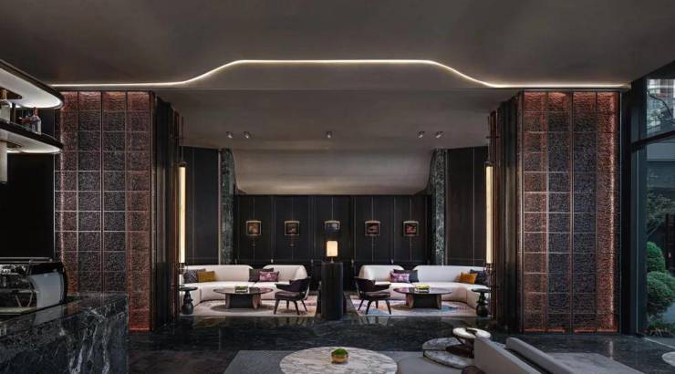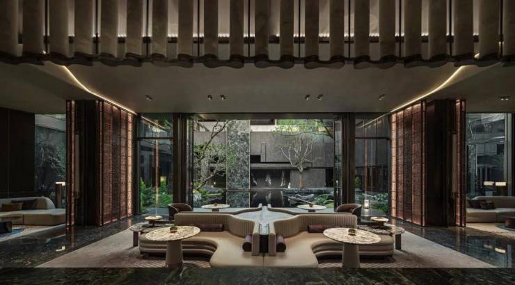 在景观的设计上,通过“山、岛、岸、湾、滩”无界五境,以多重归家礼序,将自然装进生活,为塔尖人士于四季流转间定制谧境。同时,臻选世界各地名贵树种,价值约60万全冠移植的孤植迎客松、树龄超20年以上超级朴树王,并汲取国际星级酒店的打造理念,以意大利进口绿奢石、意大利紫山水奢石等世界级奢石作为场景的点缀,毫米级的施工技法,将精奢生活敬呈每一位层峯。