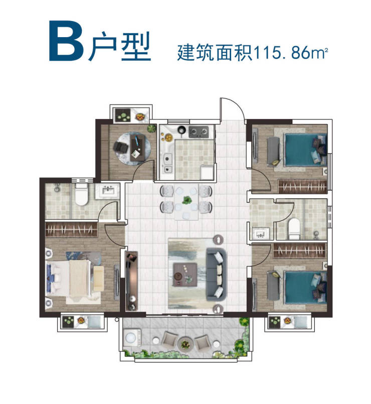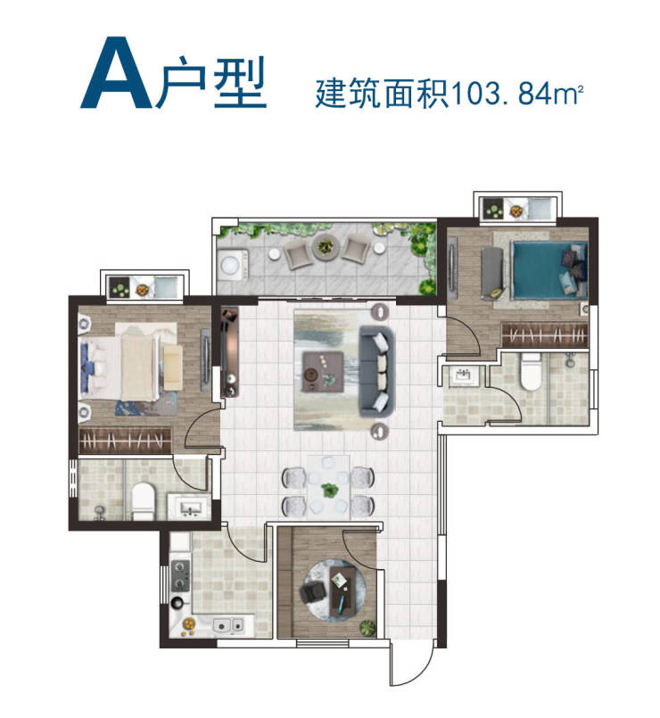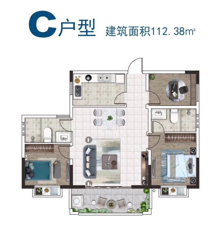 户型分为A型103.84㎡、B型115.86㎡、C型112.38㎡,A+复式型199.19㎡、B+复式型215.72㎡、C+复式型231.04㎡六种。