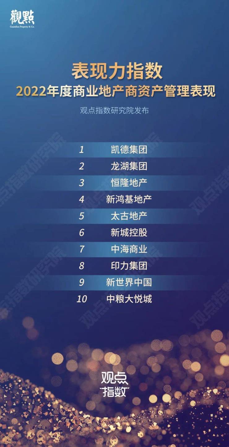 在2022年度商业地产商资产管理表现研究成果中,凯德集团、龙湖集团、恒隆地产表现突出。