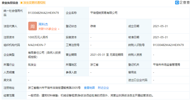 据企查查显示,该公司名称为平湖恒锐贸易公司,注册资本为1000万元,法定代表人为周科杰。经营范围包括:建筑材料销售;机械设备租赁(除依法须经批准的项目外,凭营业执照依法自主开展经营活动)。