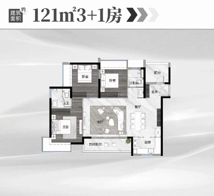 121㎡ 3+1房2厅2卫,+1房百变空间,L型入户尊崇体验,约8.1m长南北通透都荟宽厅,约5m长270°观景阳台,约46㎡豪宅式社交空间