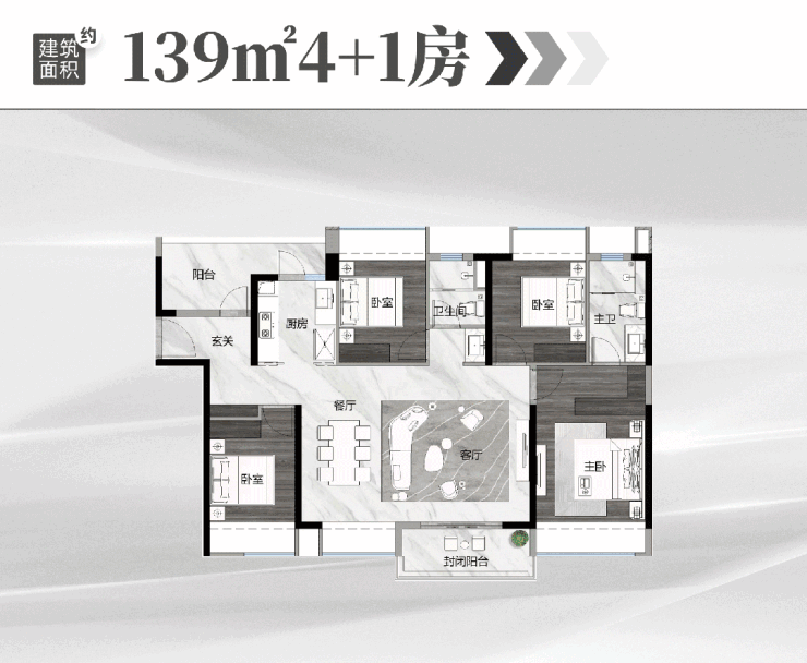 139㎡ 4+1房2厅2卫,约9㎡灵动空间,L型尊崇入户+归家双动线,约7m长都荟宽厅,南向通透四开间,灵动次卧,预留横竖双厅+西厨创意改造,全屋80cm阔景飘窗升级