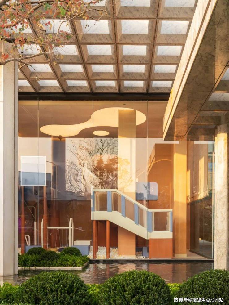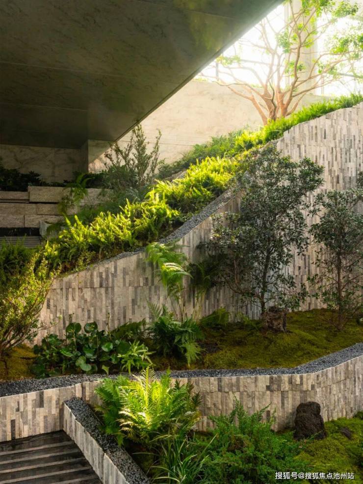 在这个立体悬浮世界里,有着天台层、归家层和下沉庭院层的垂直景观布局。从穿长廊的登高望远、到见溪潭、叠流韵的曲水流觞,再到揽河景、探幽境的探幽寻密。