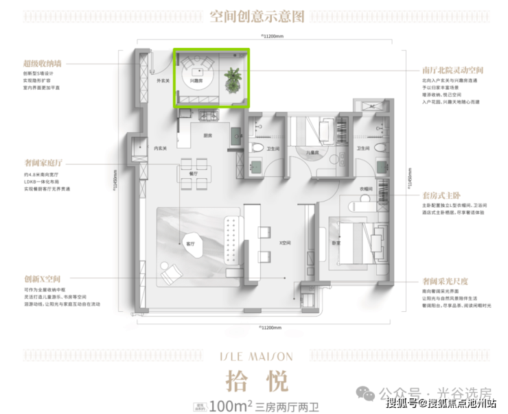 这是把过去高改甚至豪宅才能拥有的生活方式融入到建面约120平的户型内,联动整个动区南向客厅+双联阳台,就形成了一个南厅北院的格局。