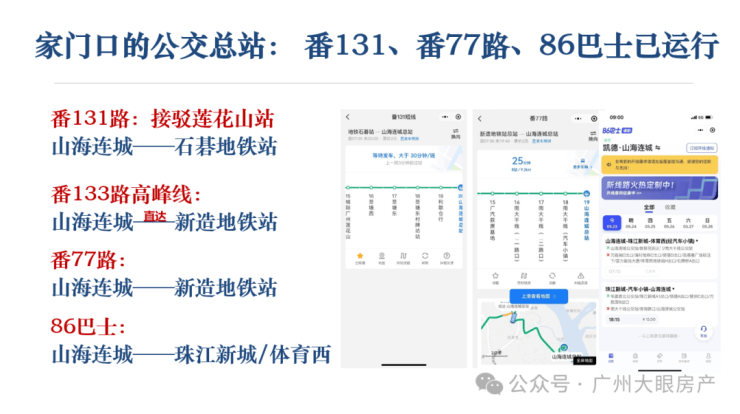 公共交通不算好,目前出行基本上靠自驾,最近的地铁4号线都要10公里,后续周边有规划地铁8号线东延线{莲花湾至万胜围}预计2027年底通车,全程8个站,通车后,莲花湾到海珠只要20分钟,且目前这边公交线路也比较少。