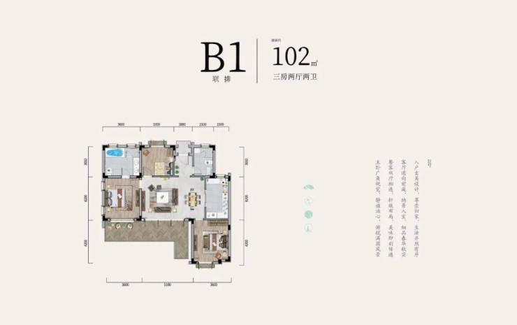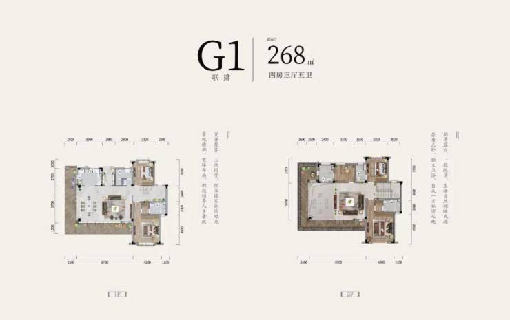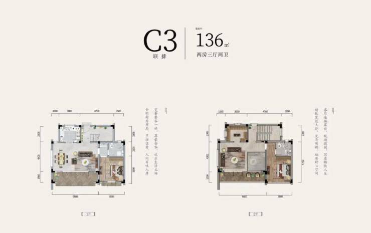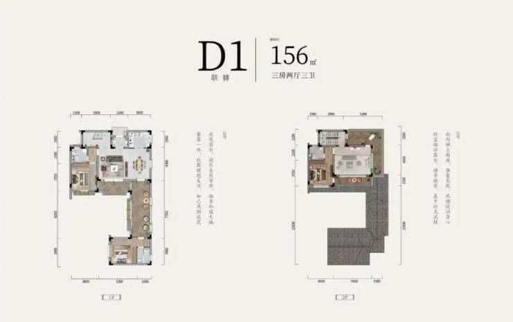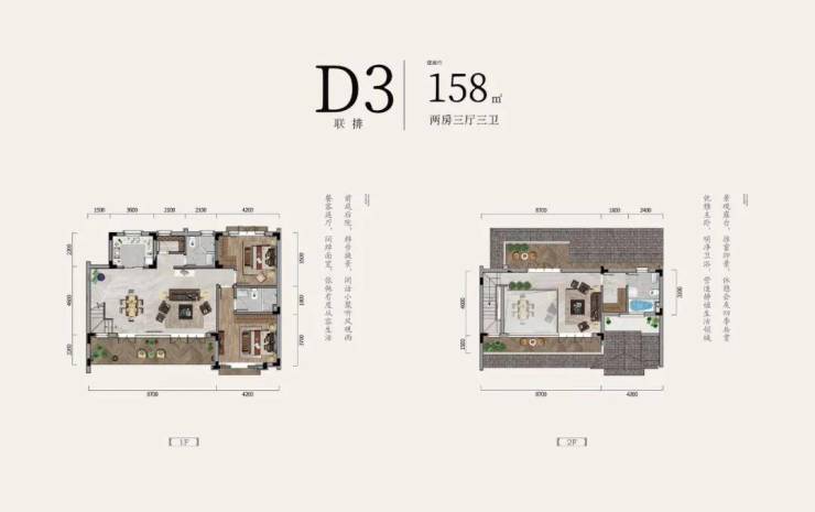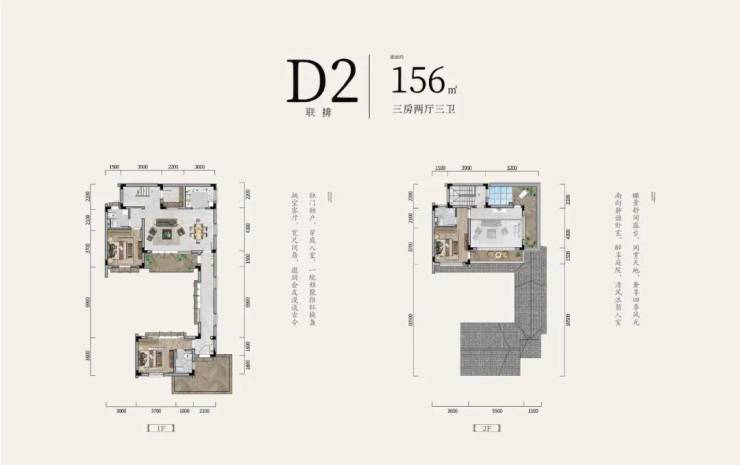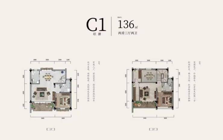 墅社区,产品面积段覆盖广,主打大开间、短进深,两层联排别墅。