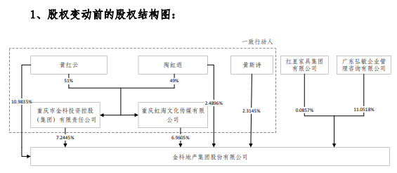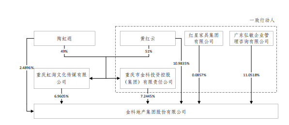 回复函显示,根据收到陶虹遐、虹淘公司发送的《关于解除一致行动的告知函》,并结合黄斯诗减持公司股份的实际情况,黄红云、金科控股、红星家具集团及广东 弘敏所签订的《一致行动协议》生效变动前后金科股份的股权结构图如下: