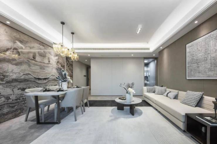 105平三房两厅两卫,在设计中淡化空间的边缘,让客餐厅和阳台一脉相连,居住感又进一步扩大了,最大程度带来阳光,和新鲜空气。约5.1米的宽厅,无论是日常休息还是会客都显得大方得体。